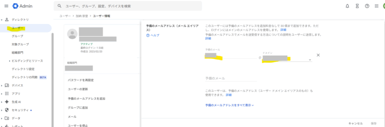 次にセカンダリドメインを使ったメールアドレスを設定したいユーザを「ディレクトリ>ユーザー」にて選択します。「予備のメールアドレス(メールエイリアス)」という項目を探してください。