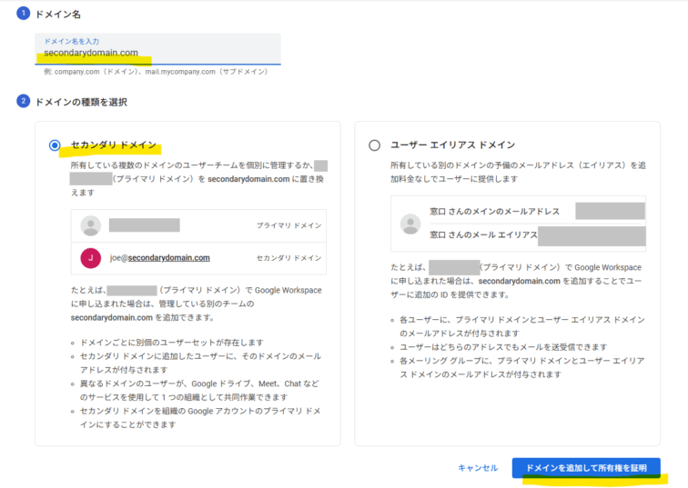 そこで、既存の Workspace 契約に secondarydomain.com をセカンダリドメインとして追加 し、既存ユーザーに エイリアスアドレス を付与する方式を採用しました。