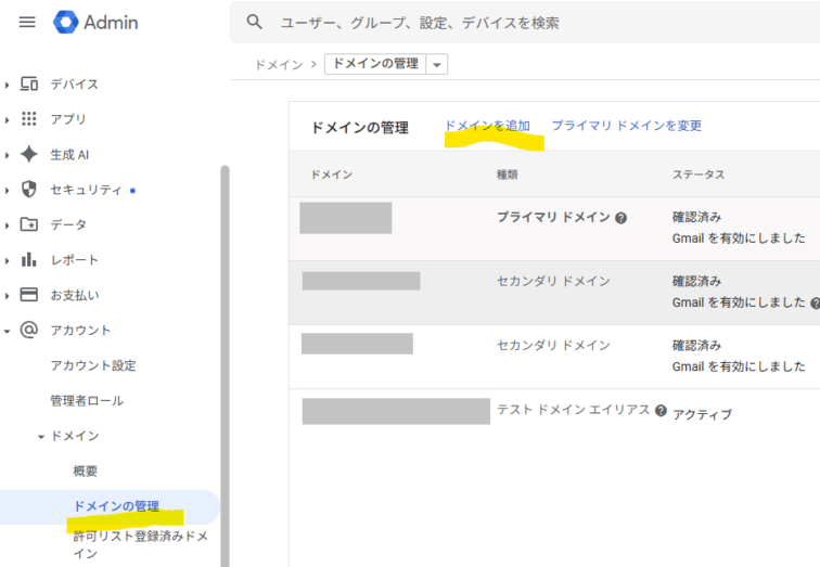 Google Workspaceの管理者ユーザでhttps://google.admin.comにログインし「アカウント>ドメイン>ドメインの管理」より、ドメインを追加を選択